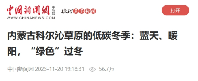 11月20日,中国新闻网刊发《内蒙古科尔沁草原的低碳冬季:蓝天、暖阳,“绿色”过冬》一文。报道称,内蒙古公司扎鲁特旗供热站推广推动区域清洁供暖改造,实施“以电代煤”,采用蓄热式电锅炉供暖,能够实现‘停电不停暖’,保障供暖的稳定性和连续性。为当地40万平方米14000户居民清洁供热保驾护航。以下为报道全文: