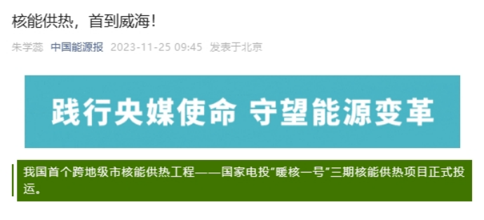 11月25日,《中国能源报》微信公众号刊发《核能供热,首到威海!》一文。报道称,我国首个跨地级市核能供热工程——bob体育app二维码 “暖核一号”三期核能供热项目正式投运。位于烟台的海阳核电在为海阳市供暖的同时,供暖区域到达威海乳山市,实现了零碳热源的跨区域互通共享。以下为报道全文: