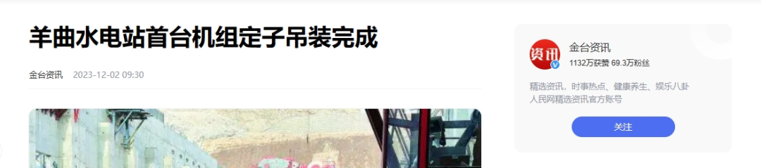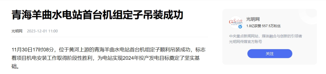 近日,新华社、光明网、中国青年网等多家媒体报道《青海羊曲水电站首台机组定子吊装成功》一文。报道称,黄河公司建设的羊曲水电站首台(2号)机组定子11月30日吊装成功,标志着羊曲水电站机电安装工作取得阶段性胜利,为电站实现2024年8月首台机组投产发电目标奠定了基础,该水电站位于青海省海南藏族自治州兴海县和贵南县交界处的黄河干流上,是青海省清洁能源外送通道的重要支撑调峰电源。电站总装机容量120万千瓦,平均年发电量约47.32亿千瓦时。以下为报道全文: