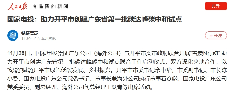 近日,人民日报客户端、新华社客户端刊发《以绿色能源助推乡村振兴——广东“雪炭N行动”助力“双碳”试点启动》一文。报道称,广东公司结合广东省“百千万工程”相关要求,聚焦能源产业与乡村振兴、“双碳”目标深度融合,科学编制了《开平市“雪炭N行动”极致方案》,规划覆盖翠山湖高新区、苍城镇、大沙镇、赤坎镇等13个行政区域,规划建设清洁能源供给类、能源技术开发类、再生资源及农林废弃物回收处置类能源项目47.6万千瓦,预计每年生产清洁电力18亿千瓦时,可减少二氧化碳排放60万吨,带动当地投资约50亿元,引入外部产业链,增加就业岗位约2000个,为大沙镇等农业镇创收不低于2000元/户。以下为报道全文:
