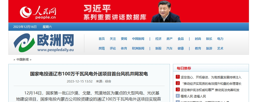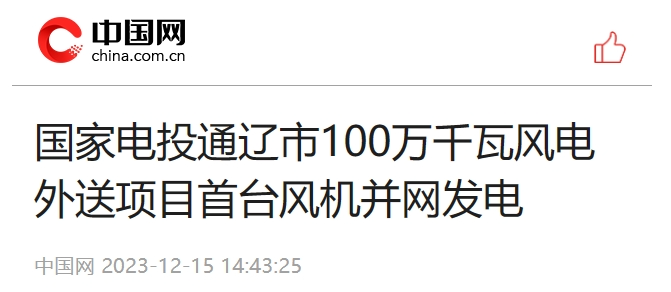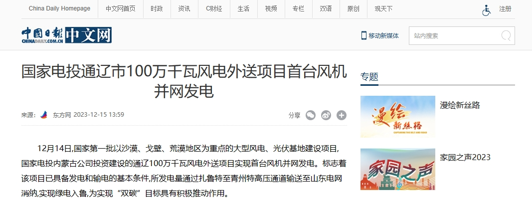 12月15日,人民网、中国日报、中国网等多家媒体报道分别发表《bob体育app二维码 通辽市100万千瓦风电外送项目首台风机并网发电》一文。报道称,内蒙古公司投资建设的通辽100万千瓦风电外送项目是国家第一批以沙漠、戈壁、荒漠地区为重点的大型风电、光伏基地建设项目,所发电量通过扎鲁特至青州特高压通道输送至山东电网消纳,实现绿电入鲁,为实现“双碳”目标具有积极推动作用。以下为报道全文: