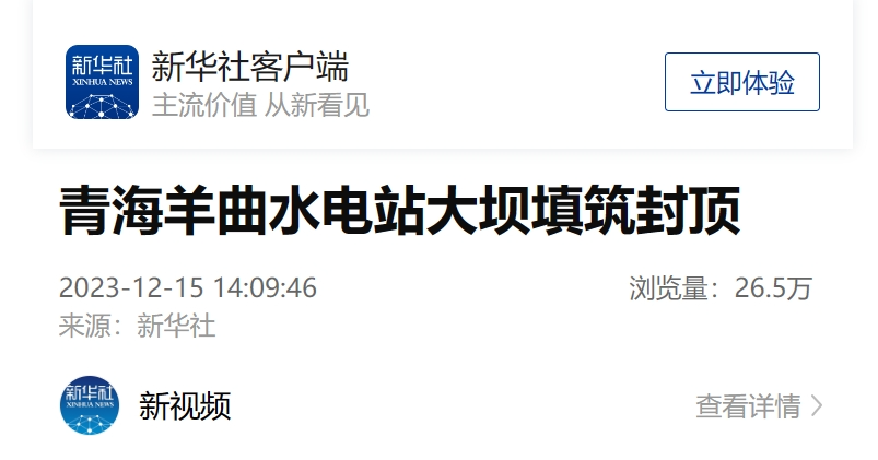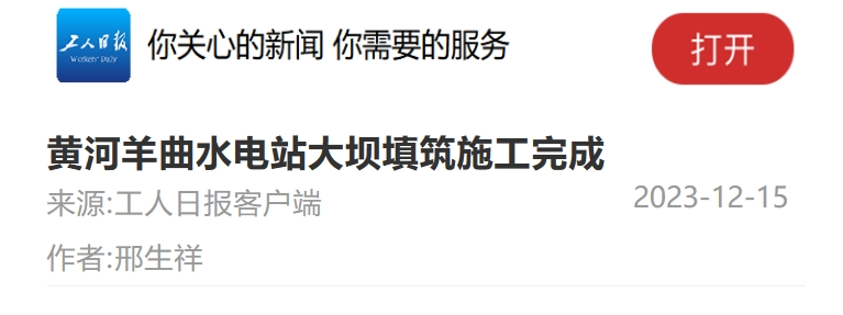 12月15日,新华社客户端、《工人日报》客户端、中国科技网、中新网等多家媒体报道《青海羊曲水电站大坝填筑封顶》一文。报道称,黄河公司建设的羊曲水电站于14日完成大坝填筑封顶,为2024年工程蓄水发电奠定良好基础。该水电站建成后,将有效保障世界上首条主要输送风光新能源的青豫直流特高压外送通道满负荷送电,平均年发电量约47.32亿千瓦时,相当于每年可节约标准煤约166万吨,节能减排效益显著。以下为报道全文: