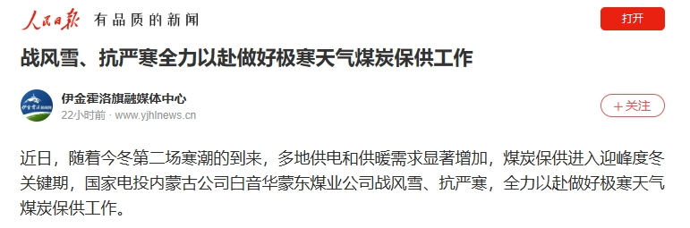 12月27日,人民日报客户端刊发《战风雪、抗严寒全力以赴做好极寒天气煤炭保供工作》一文。报道称,随着今冬第二场寒潮的到来,多地供电和供暖需求显著增加,煤炭保供进入迎峰度冬关键期,bob体育app二维码 内蒙古公司白音华蒙东煤业公司及时启动防寒防冻应急预案,同时,充分利用智慧化手段参与极端天气煤炭保供工作,确保极端天气能源保供工作平稳有序。以下为报道全文: